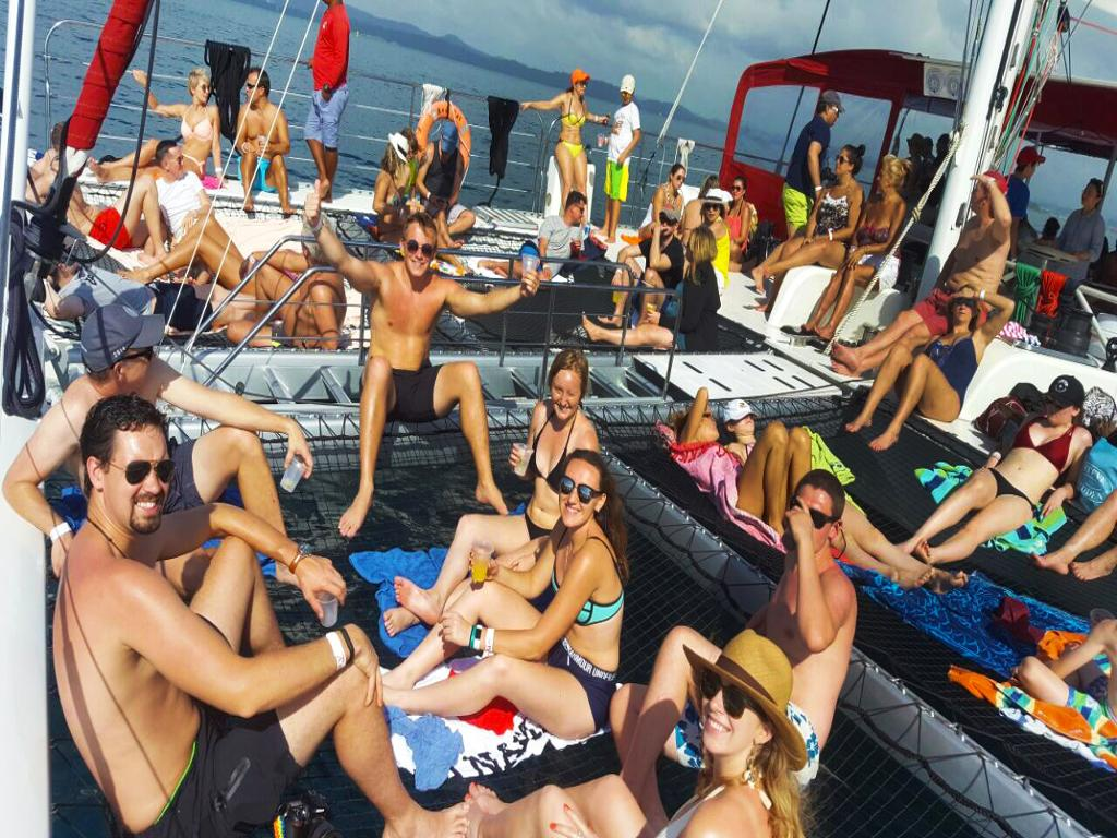 Enjoy the breathtaking views of the Panama city skyline, Cinta Costera and ships waiting to cross Panama Canal, until you reach the Island of Taboga on a 45 minutes ride; During this time light snacks will be served. After reaching Taboga we sail to the back side of the Island, our secret spot, an amazing bay with beautiful natural views, where you will have the opportunity to jump off the boat and have your first swim! We also have a stair with direct access to the water. Climb back into the boat to enjoy a cold beer while we sail to the main side and make our second stop on the town side, where you'll be provided with transportation to the beach and be able to visit the small village of Taboga. You can also relax in the catamaran's big nets, enjoy the sun, swim or use our floating noodles. You will be able to jump from the boat to the water too. After the town visit, lunch will be served on board of the catamaran and later, we'll sail back to port. If the wind is favorable during our way back the sails will be opened and the party continue.