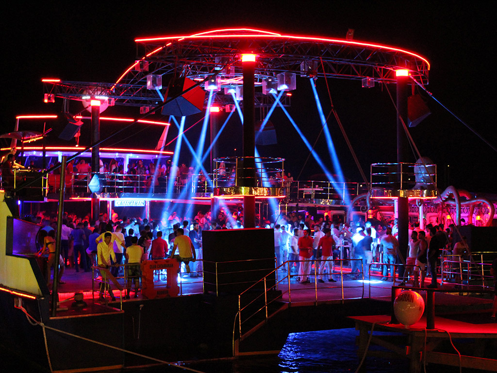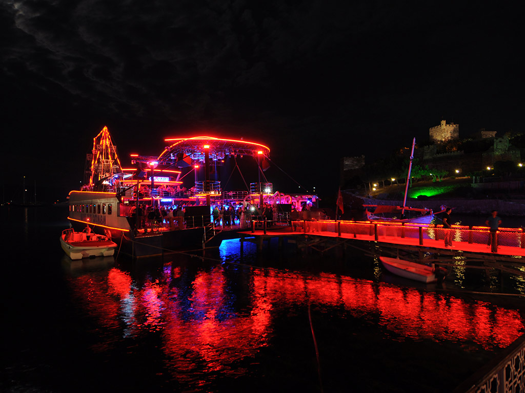 After 10 pm, on the port, among the Turkish and foreign visitors sipping their first drinks prepared by the master barmen and barmaids are frequently the stars of the television, cinema, music and jet set circle. As the rhythm of the night and music picks up speed around past midnight, the party people get ready to groove whole night on the transparent dance floor just above the fishes, and they start to leave the port to flock the boat. The party boat leaves the shore with its four bars in different concepts, VIP booths, customary dance shows, glamorous dancers and famous DJs and the night gets fired up and the dance aboard begins.