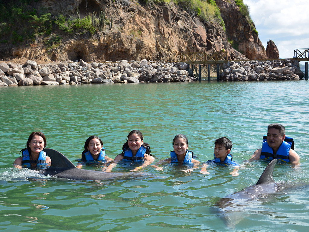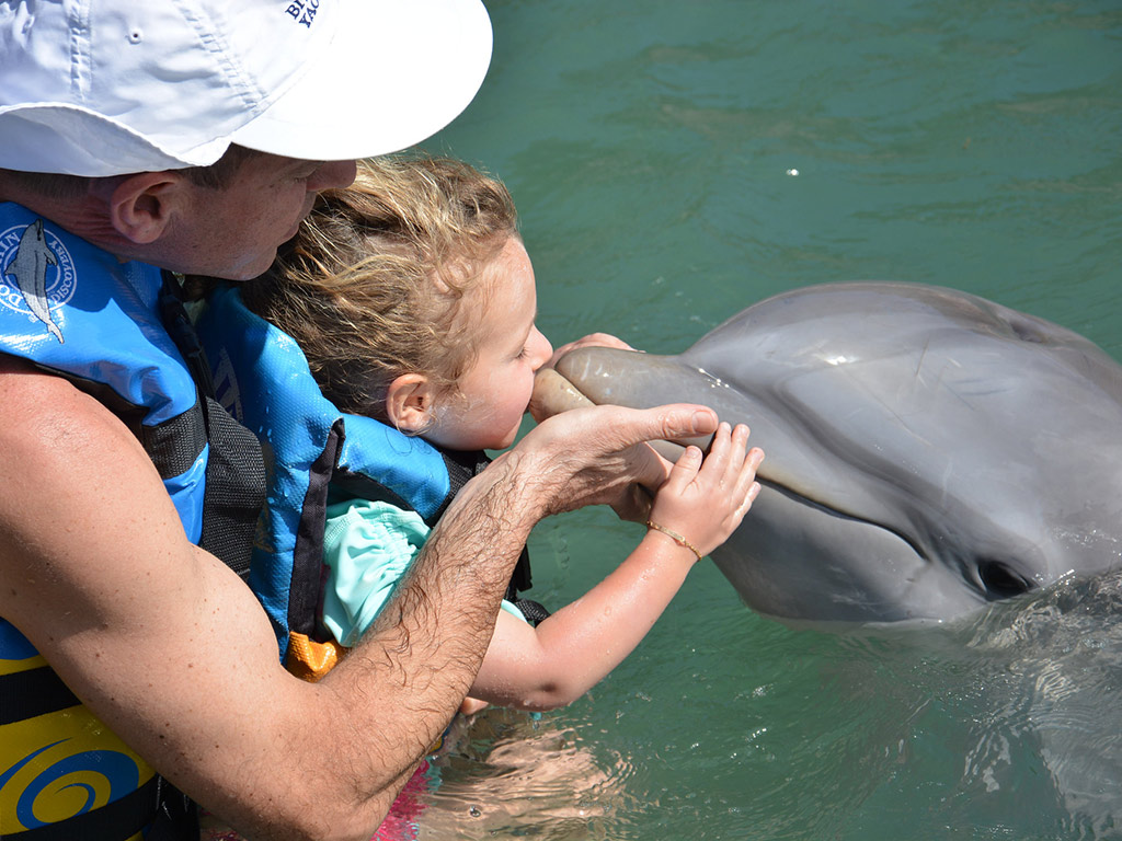After being given some interesting information about dolphins, you will have an amazing encounter as you enter the world of these gentle animals. They will give you a kiss and allow you to caress them while standing in knee deep water. This adventure is best for those who are not comfortable swimming in the sea and the very young. This also is a young family favourite as it gives the little ones a chance to interact with one of the world’s most beautiful creatures.