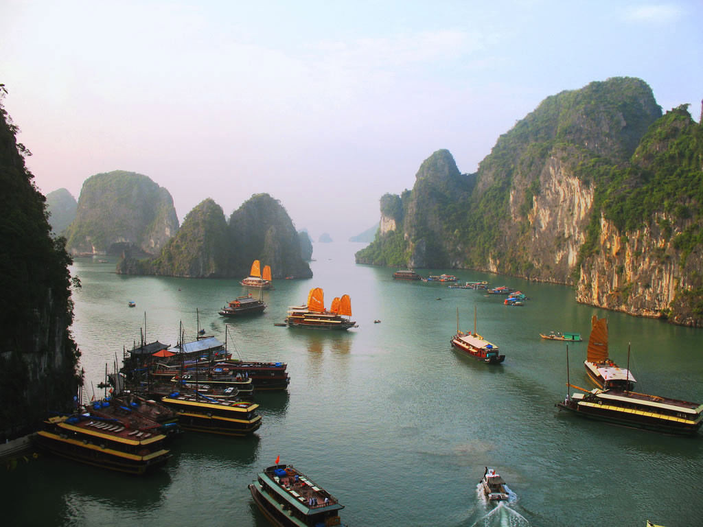 Halong Bay (Bay of the Descending Dragon) is designated a UNESCO World Heritage Site. Magnificent Halong Bay, with its 3,000 islands rising from the clear, emerald waters of the Gulf of Tonkin, is one of the natural marvels of Vietnam. These tiny islands are dotted with innumerable beaches and grottoes created by the wind and the waves. Observing the limestone rocks rising up from the sea and red sailed junk boats sail by will be a truly memorable experience. The scenic 3-hour drive from Hanoi City to Halong with spectacular views as you pass through seemingly endless green paddy fields with women in conical hats working in the rice fields with their water buffalo. You will be passing through the organic farmland, local villages and busy markets guests will have the opportunity to observe how Vietnamese people go about their daily lives. Upon arrival at Halong Bay pier, you will continue to take a relaxing 4 h boat trip through the Bay with a fresh seafood lunch is prepared and served on board. Then transfer back to Hanoi.