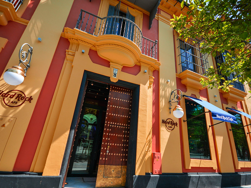 Hard Rock Cafe Seville is located in a beautiful building that was constructed with historical values in mind. The multi-level Cafe includes indoor seating over two floors, an upscale vibrant atrium bar and a Rock Shop. Taking inspiration from local architecture, using traditional Sevillian materials and finishes throughout the design, the highlights are its prominent arches, compelling ceramic tiles and wooden fixtures.