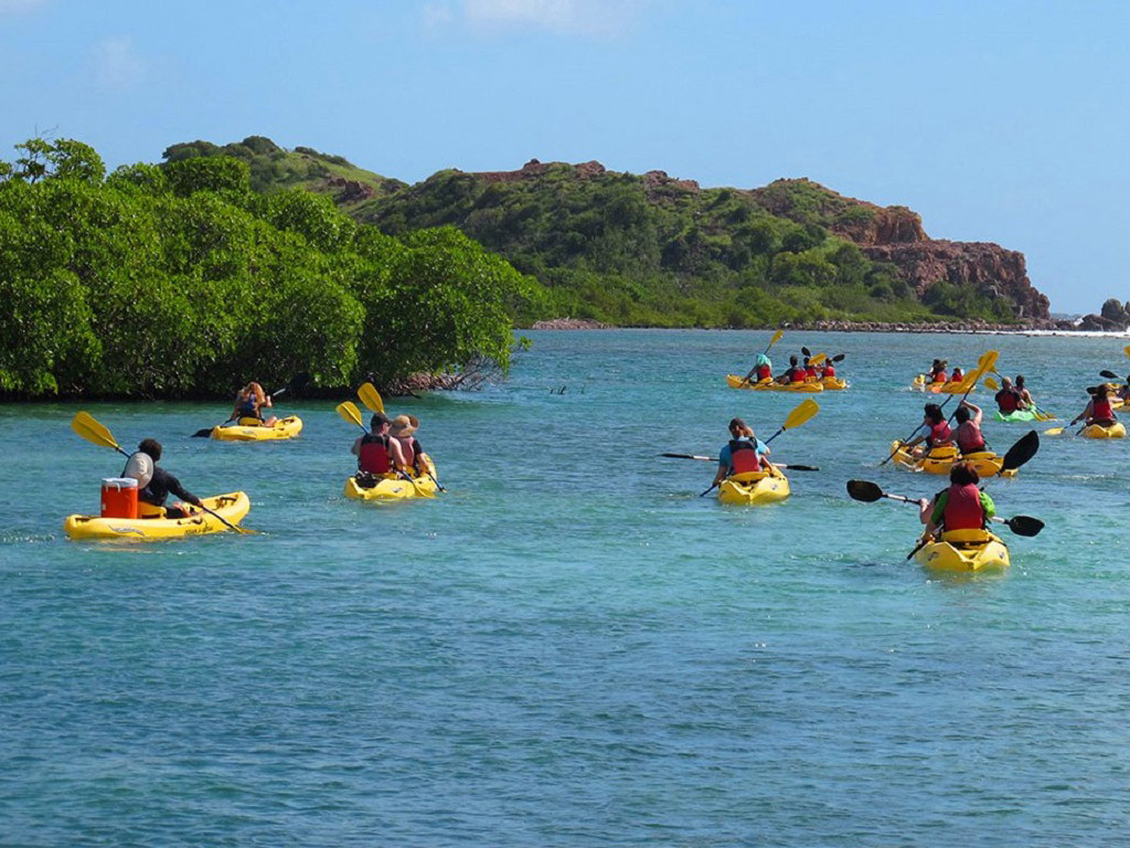 Paddlers glide in clear shallow water and often see southern sting rays and spotted eagle rays gliding beneath them with an occasional show of one jumping into the air. Arrive at the southernmost tip of St. Thomas where a fringing coral and shell rubble barrier reef divide the crystal clear waters of the lagoon and the Caribbean Sea. Snorkel a coral-fringed mangrove nursery with easy beach entry snorkel in the clear protected waters.