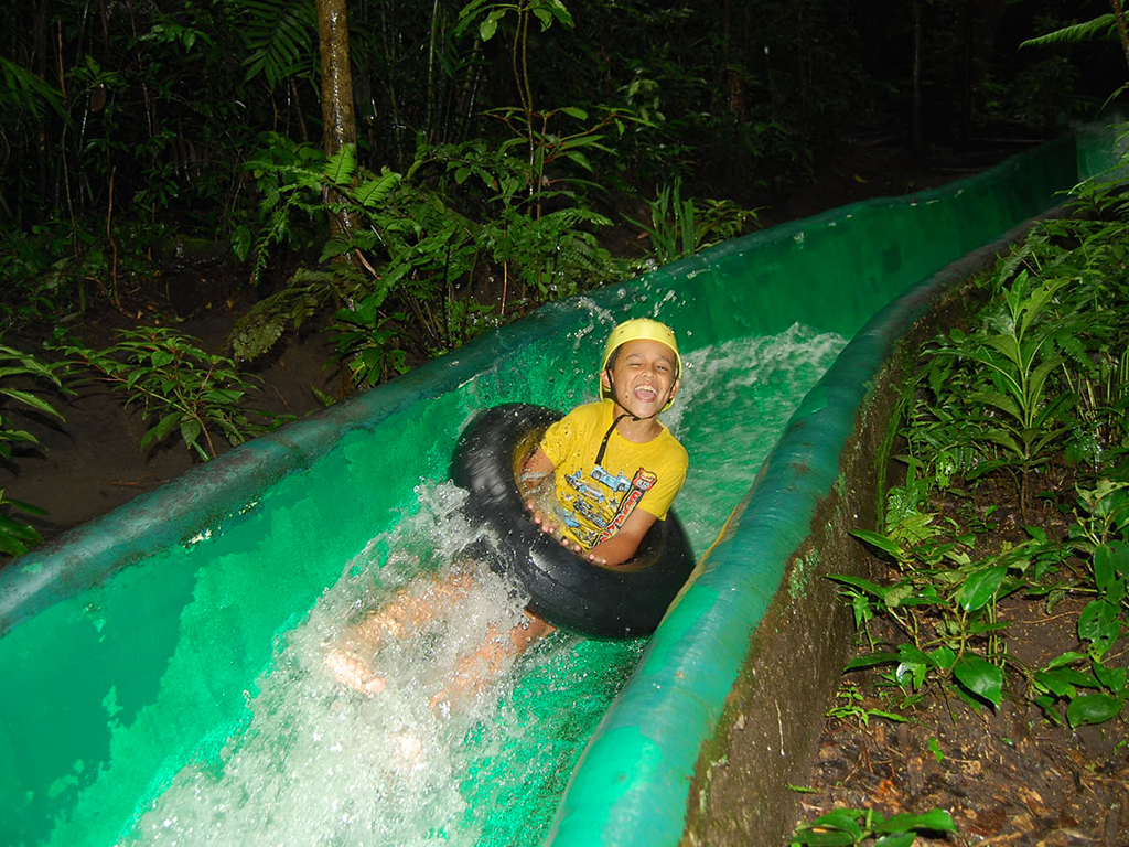 The Buena Vista Mega Combo is a full day tour that includes the canopy tour, a thrilling waterslide and a visit in horse or tractor to the waterfall and to the hot springs spa. A delicious buffet lunch full of traditional Costa Rican specialties is also included in the Buena Vista Combo. Hot Spring Spa is a gorgeous hidden paradise surrounded by forest, streams, and wildlife. Our waterslide is the only one of its kind in Costa Rica constructed totally inside the forest. It is 420 m. (1365 ft.) long and guarantees an exclusive, original and very exciting experience.