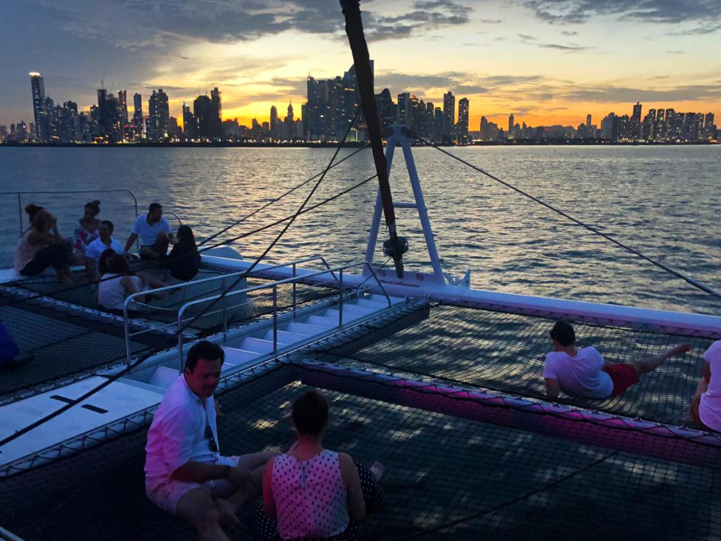 See the wonders of the City from the best seat in the house-on board the Catamaran! While having a cold drink lying down in our big nets, you will be able to see the following points of interest: The most luxurious artificial island of Latin America, Skyscrapers, Big ships waiting to cross the Panama Canal, Causeway of Amador, The Old City and the Bridge of the Americas; all this with a beautiful sunset behind!